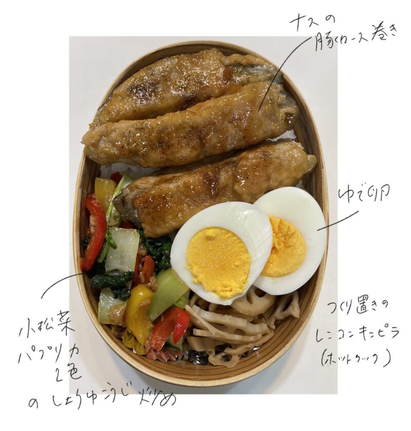 昨日は生姜焼きにしたから、今日をナスを巻いてみようと思って作ったお弁当です。