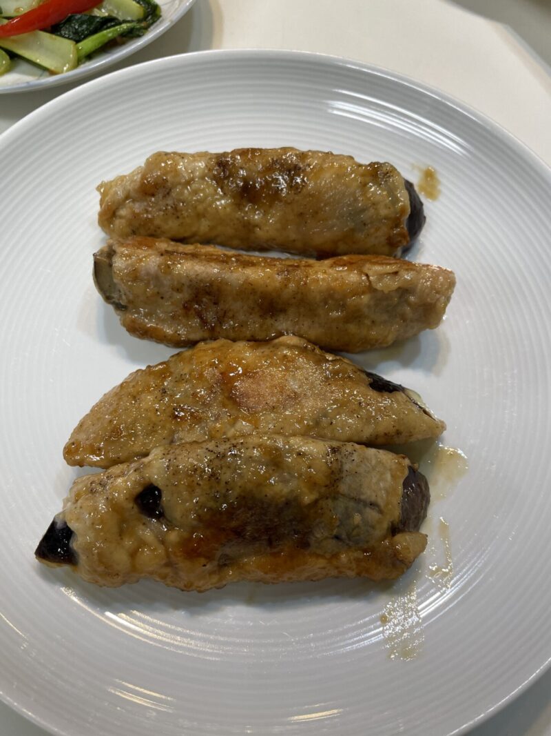 ナスの豚肉巻きが甘辛くて、ご飯が進みそうです。