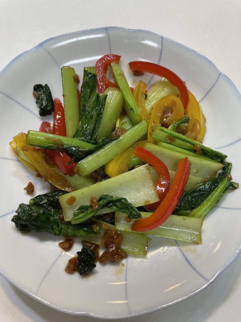 小松菜とパプリカ(黄・赤)をごま油で炒め、塩少々と醤油こうじで味付けしました。