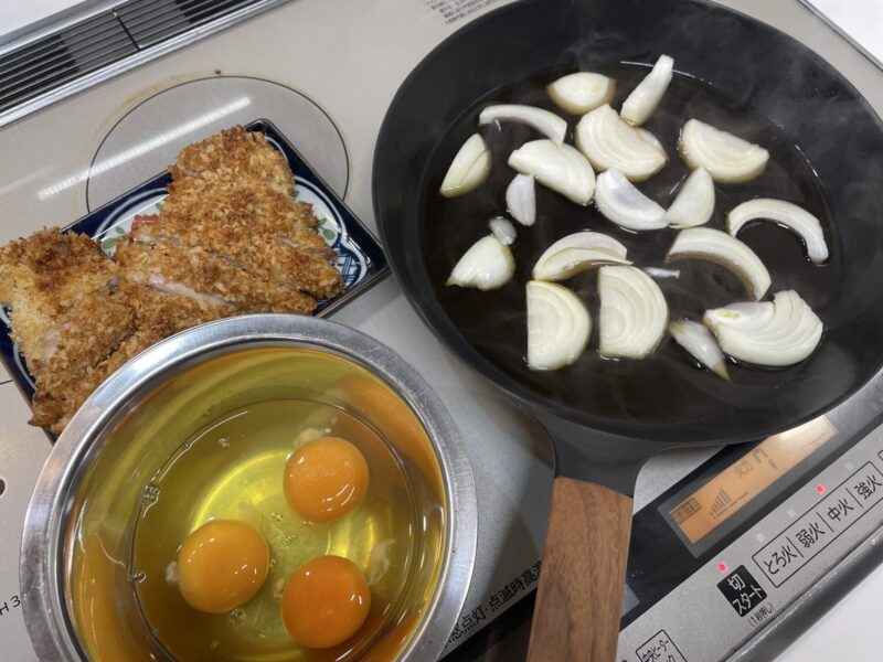 玉ねぎがしんなりしてきたら、チキンカツを乗せて。