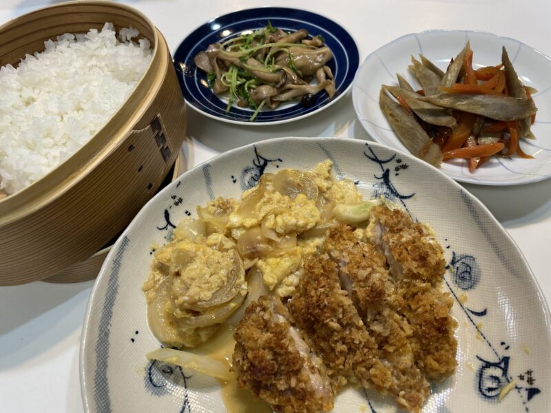 ホットクックにまかせている間に、チキンカツの卵とじや豆苗の炒め物を作ったので、時短になりました!