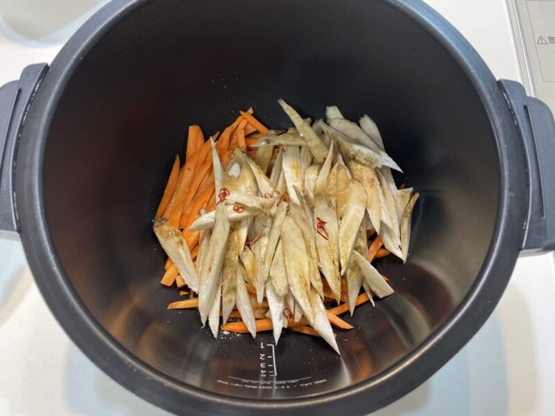 ③ 水気を切ったごぼうと人参をホットクックの内鍋に入れる