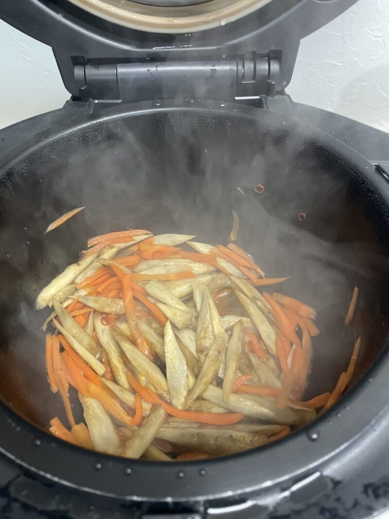 温度を自動でコントロールしながら、まぜ技ユニットが具材をやさしくかき混ぜてくれるので、きんぴらのような副菜も安定した仕上がりになります。