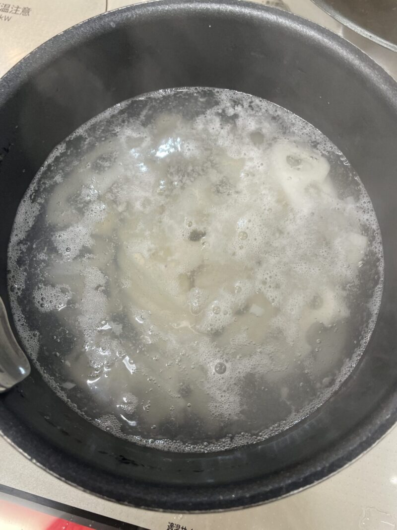 - レンコンはスライスし、アスパラとは別の鍋で塩を入れた熱湯で柔らかくなるまで茹でる