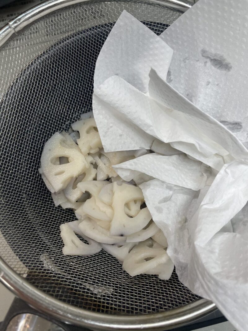 - レンコンを水にさらし、水気をしっかり拭き取る