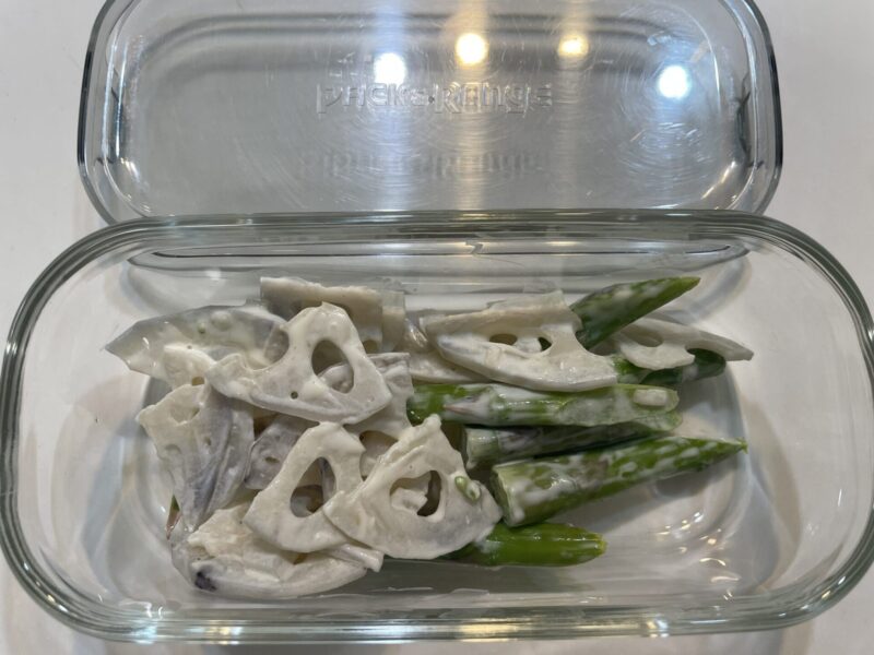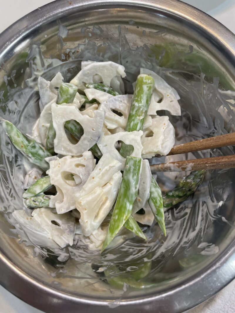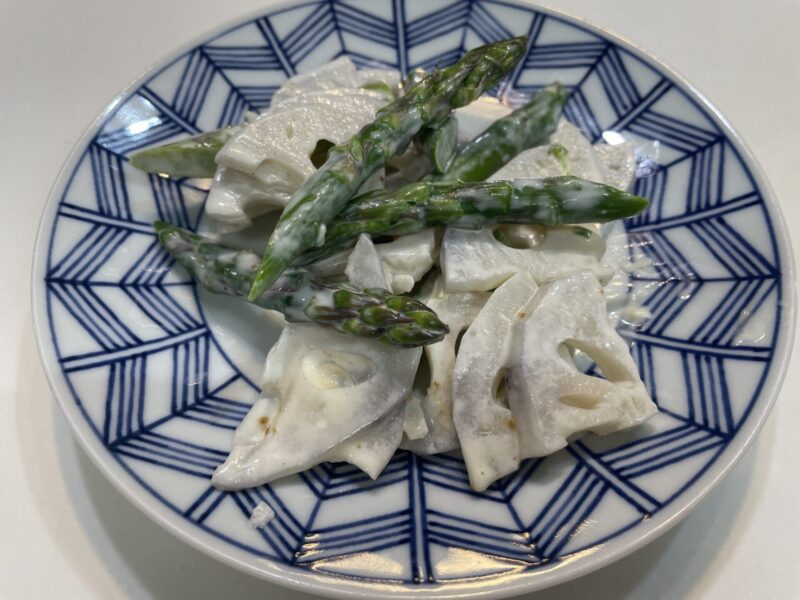 シャキッとしたレンコンと、やわらかすぎないアスパラの食感が相性抜群で、マヨネーズのコクでしっかり味がまとまります。