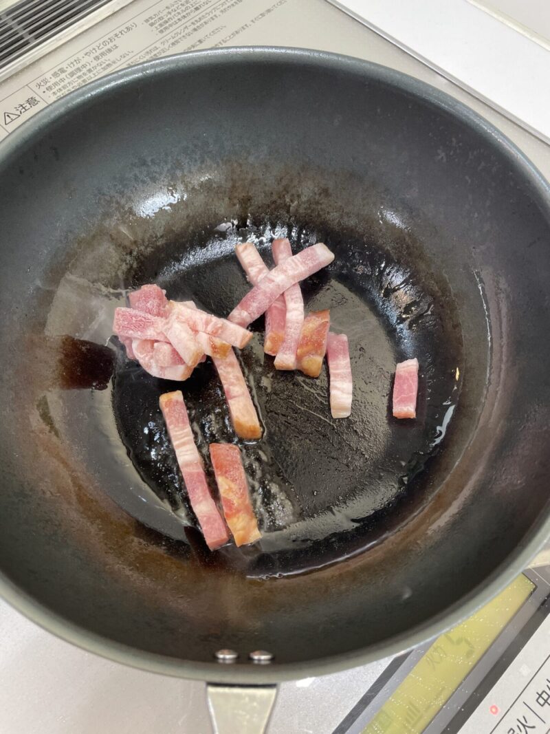 ② ベーコンに軽く焼き色がついてきたら