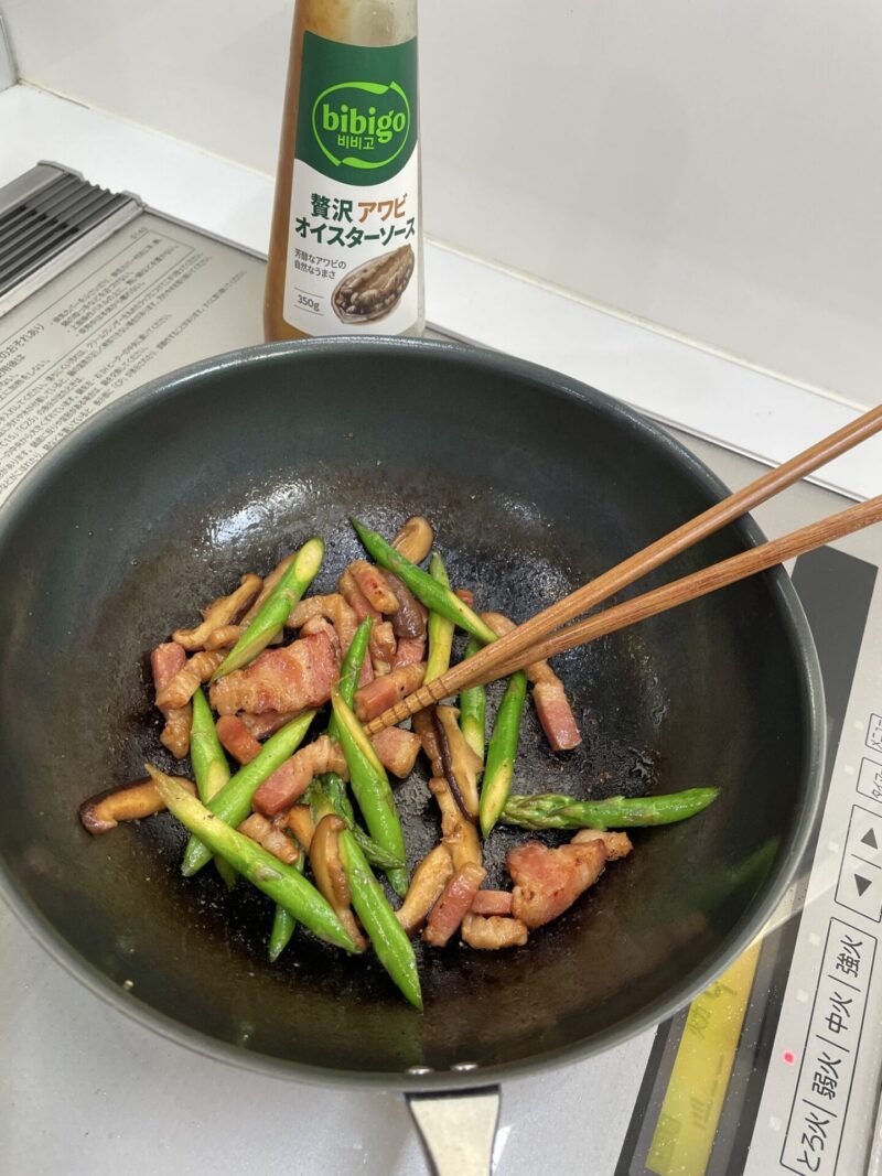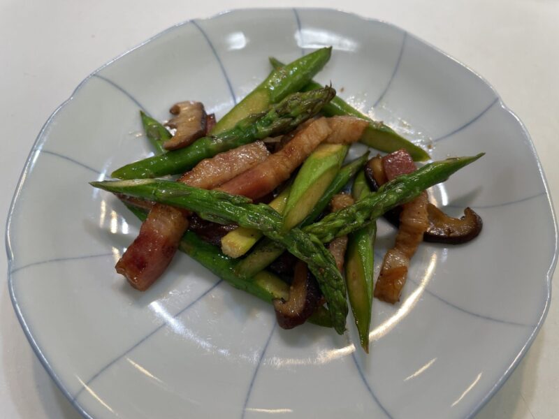 お弁当のすき間にぴったりな、アスパラと椎茸とベーコンのオイスター炒め。