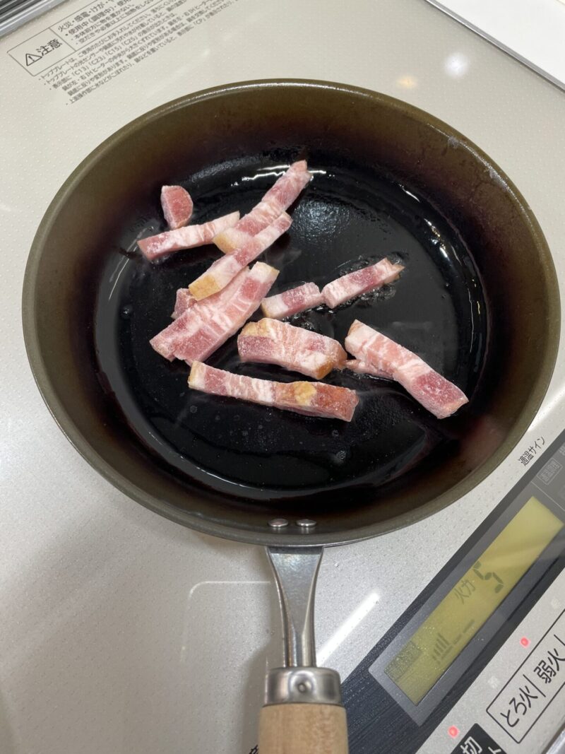 ① フライパンに油をひき、ベーコンを炒めます。