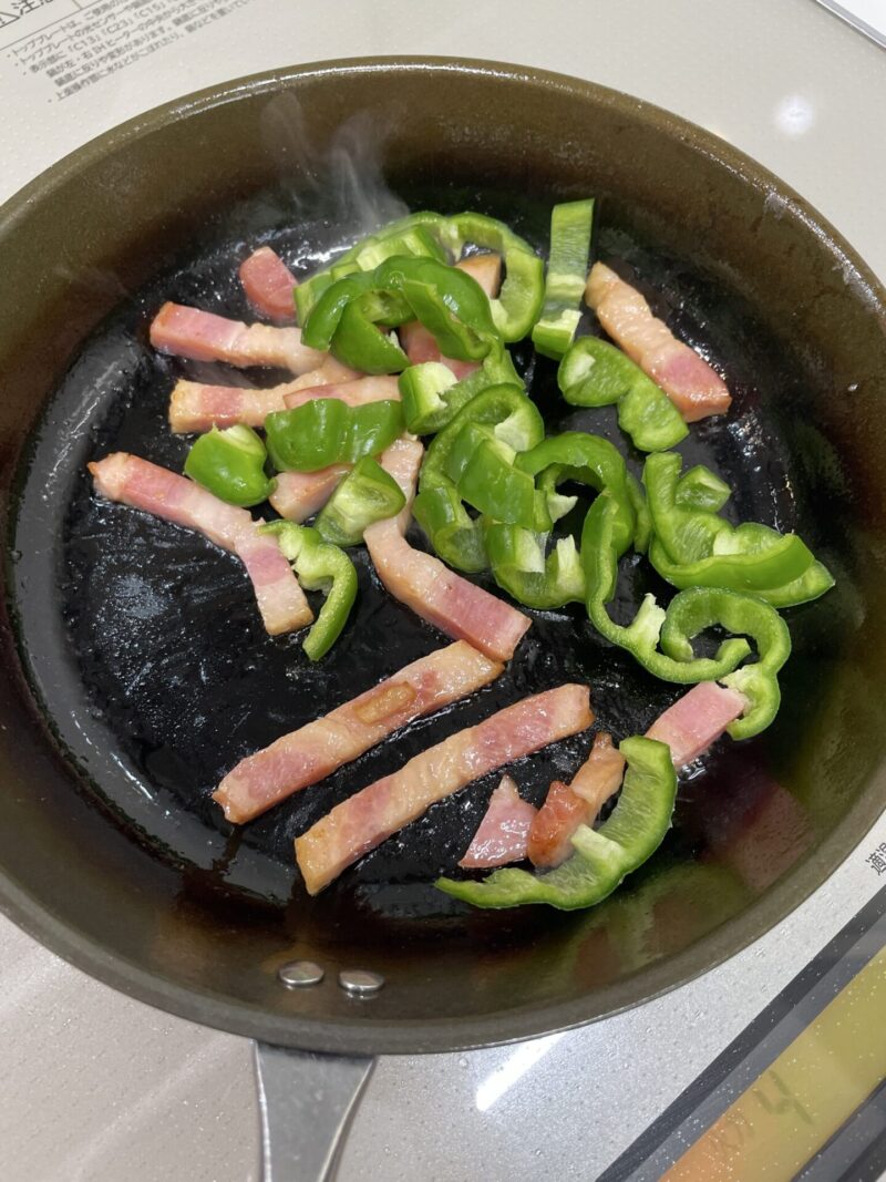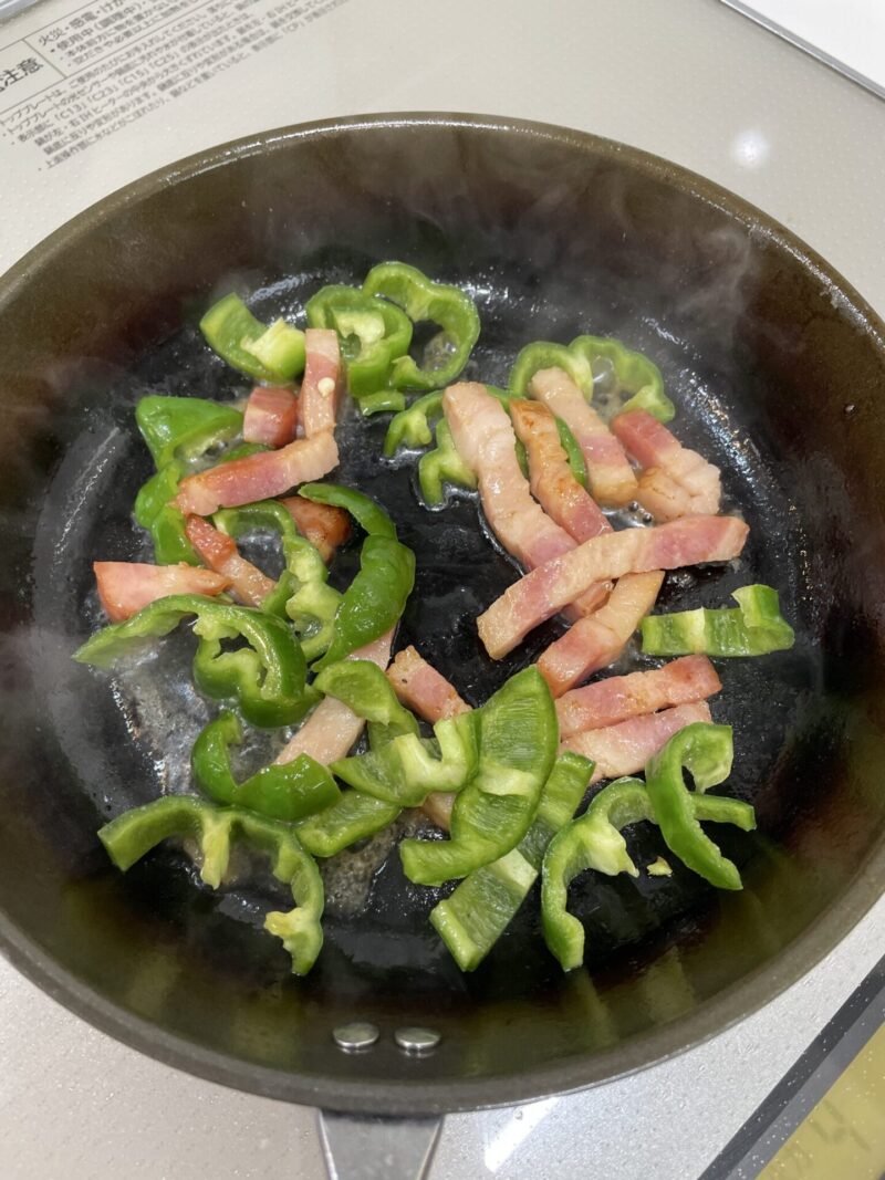② ベーコンがほぐれてきたら、5ミリ幅に切ったピーマンを入れて一緒に炒めます。