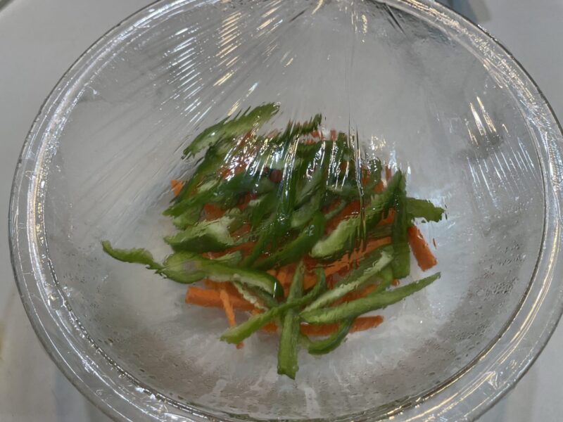 ④ 加熱した人参にピーマンを加え、再度ラップをしてさらに1分加熱する。