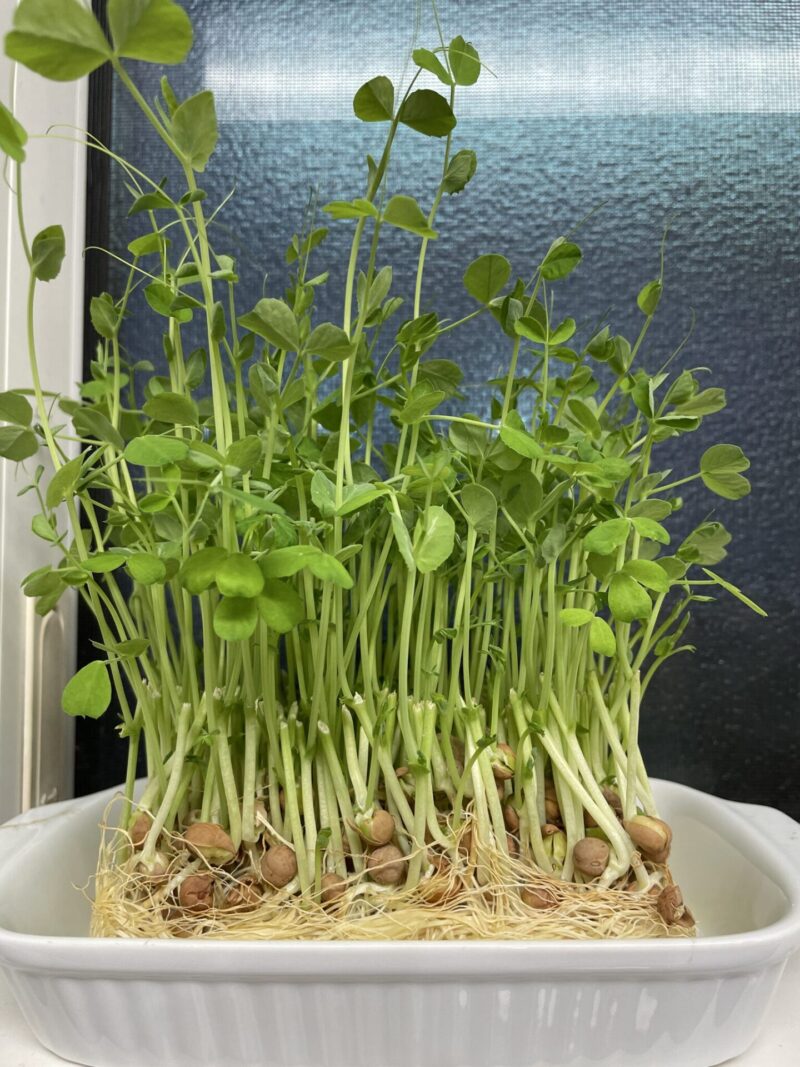 今回は、一度使った豆苗を再生栽培してもう一度収穫したものを使用。