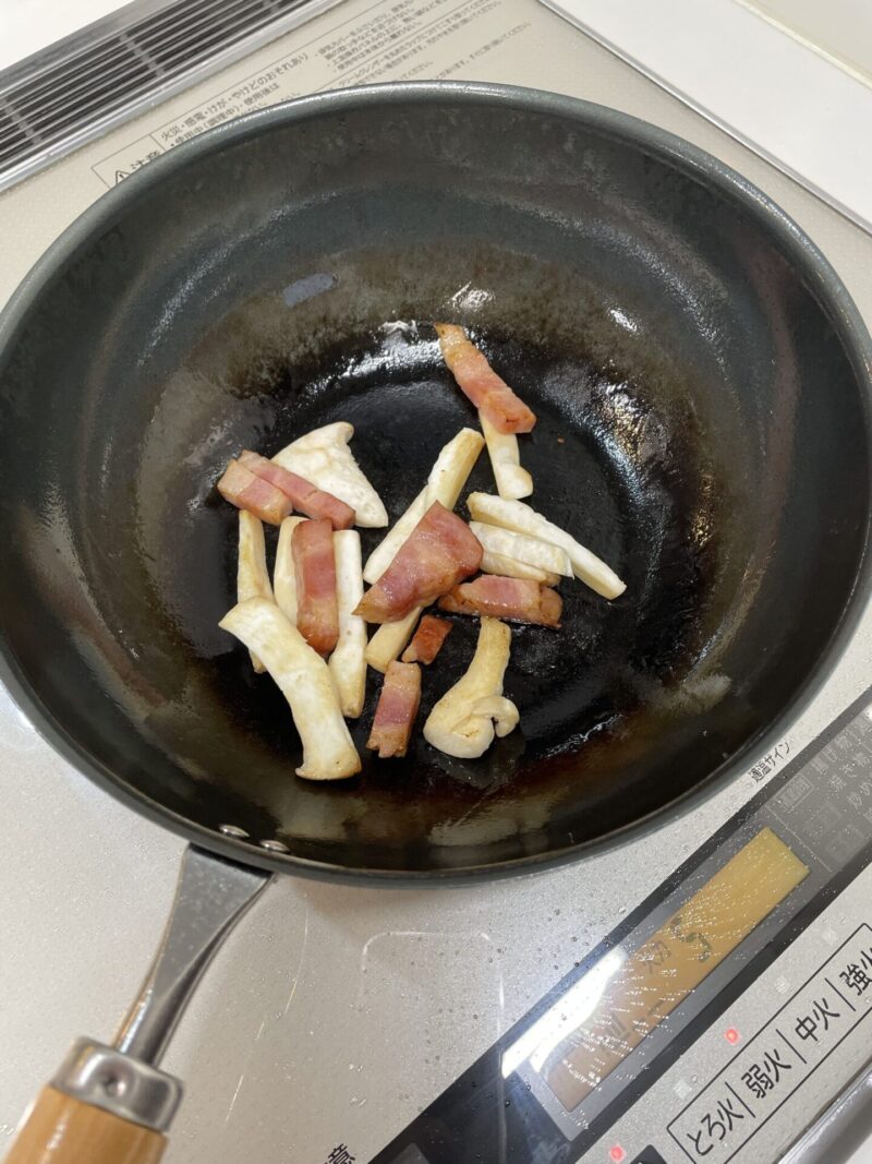 ④ ベーコンがほぐれてきたらエリンギを加え、油をなじませる。