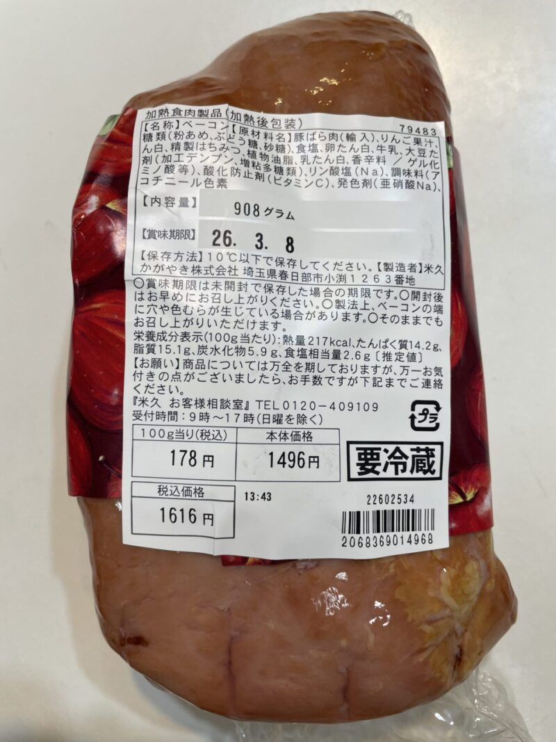 我が家でよくリピートしているコストコ商品の一つが、アップルスモークベーコン(林檎のベーコン)。