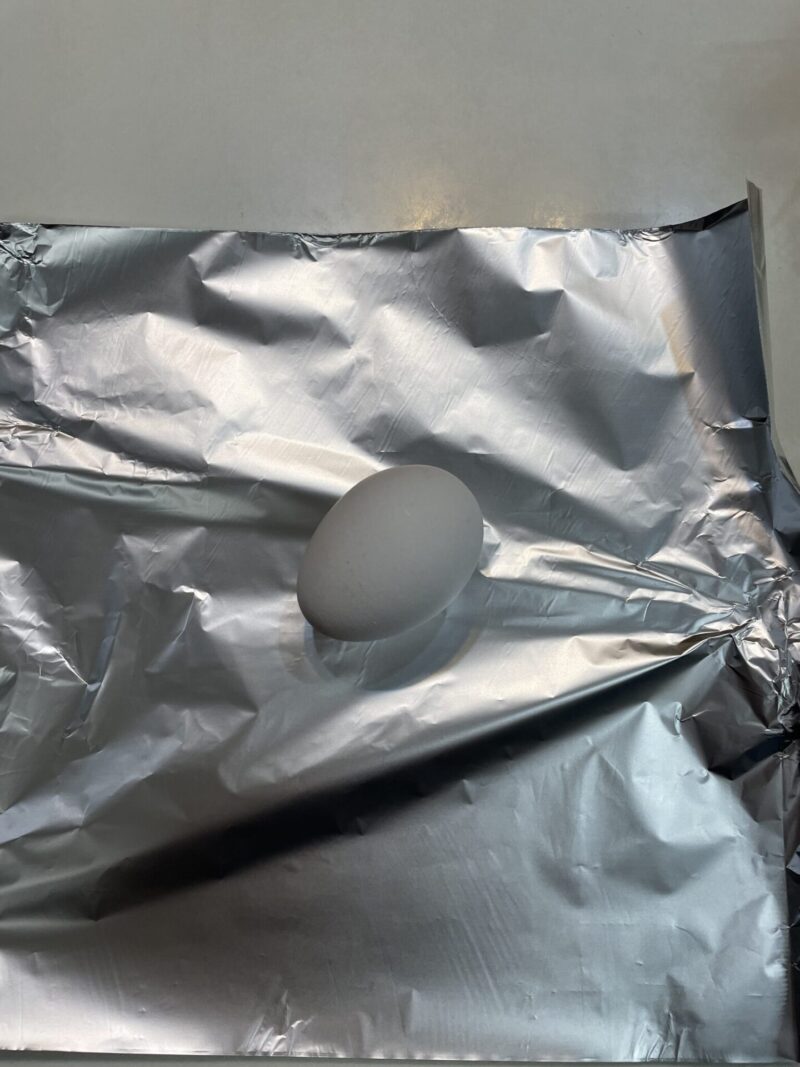 ⑤ アルミホイルに包んだ生卵を、角皿の隅に置く