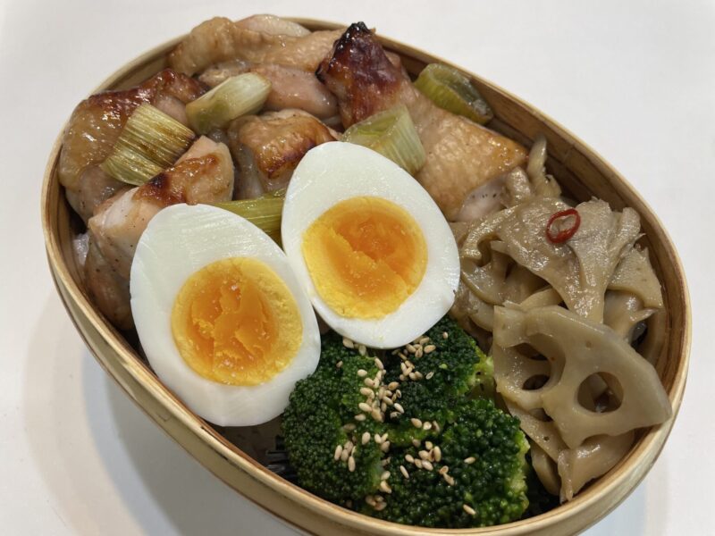 3品同時調理で、メインのグリルチキンと副菜2品を作った日のお弁当をご紹介。