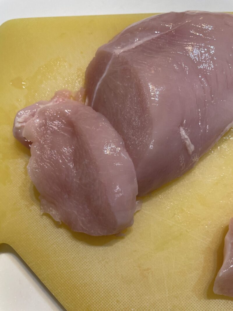 鶏むね肉でも、繊維を断ち切るように切ることで柔らかく仕上がります。