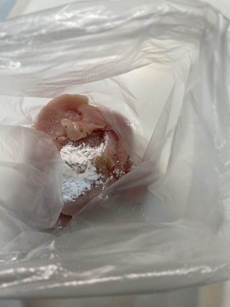 ② 鶏むね肉をアイラップなどのビニール袋に入れ、塩こしょうと片栗粉を入れて全体にまぶします。