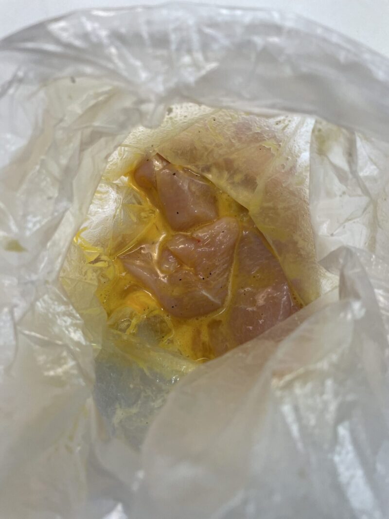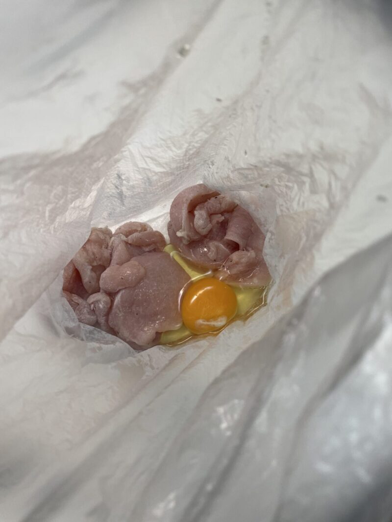 ③ 袋の中に卵を1個割り入れ、卵を潰しながら鶏むね肉全体に絡めます。