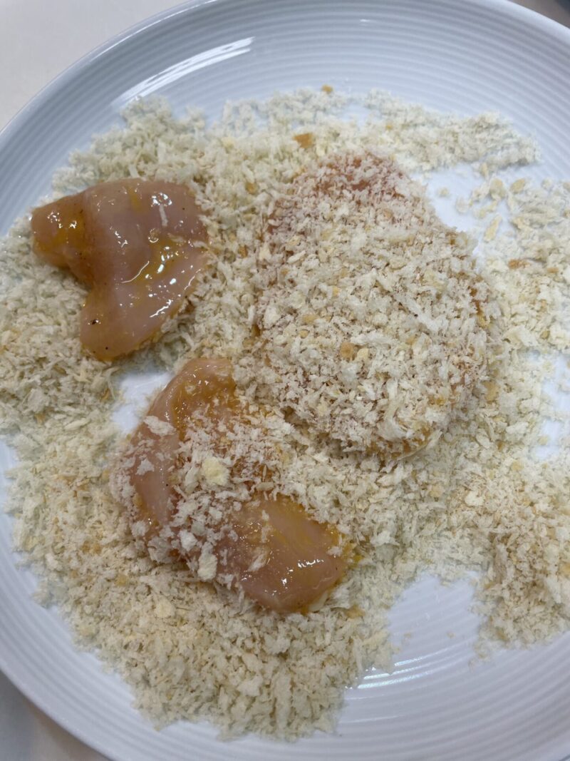 ④ お皿にパン粉を広げ、鶏むね肉にパン粉をつけます。