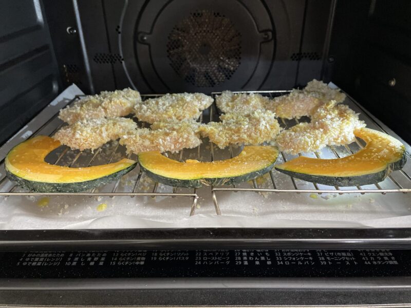 さらに今回は、かぼちゃの薄切りも一緒に並べて2品同時調理。