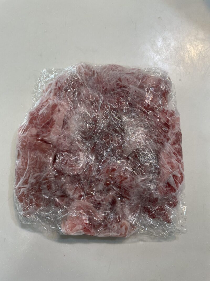 コストコで購入した豚ロース薄切り肉を、こま切れにして冷凍保存しておくととても便利です。