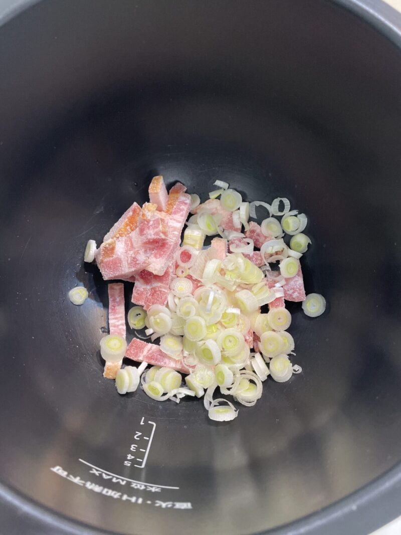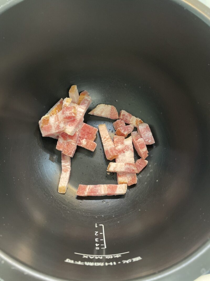 1.ホットクックの内鍋に、カットしたベーコンを入れる