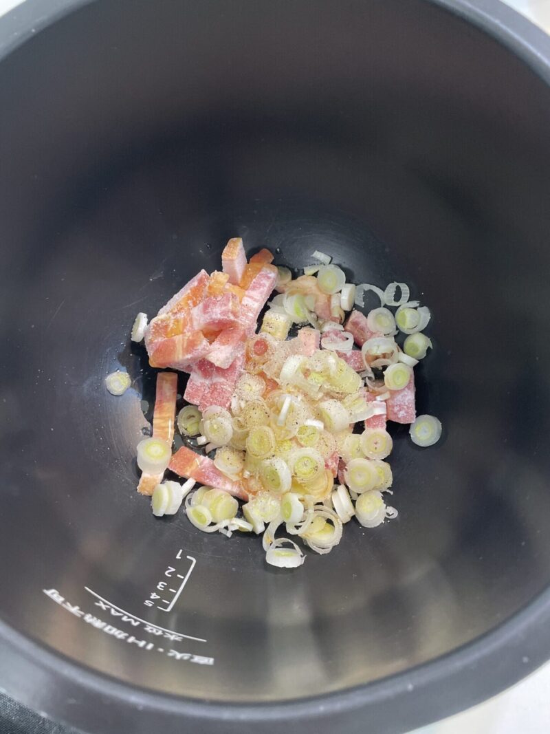 ホットクックで作る、ベーコンとネギと卵のチャーハンのレシピです。