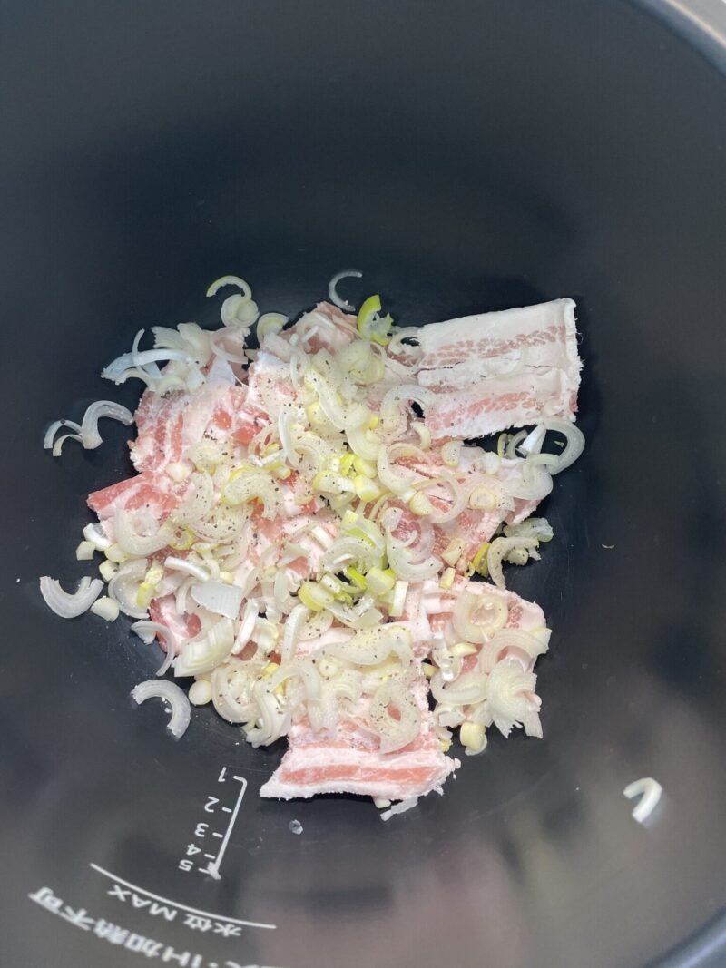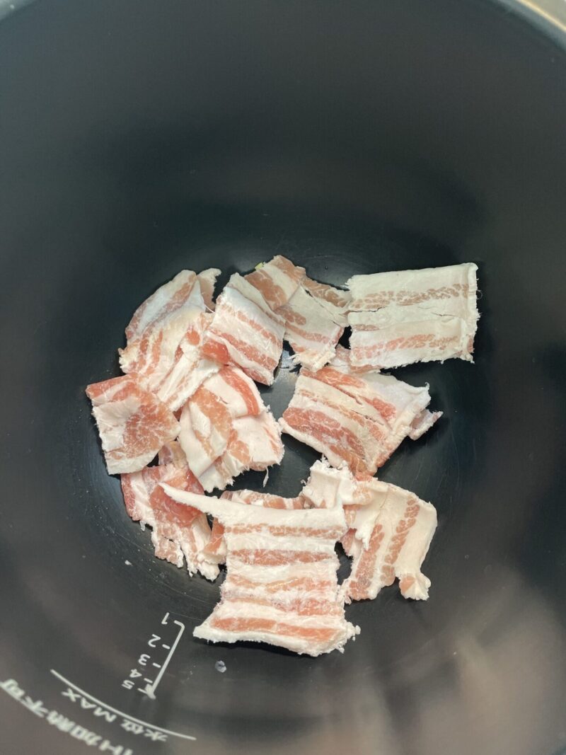 ホットクックの内鍋に豚バラ肉を入れて、塩こしょうをふり、ごま油を大さじ1回しかける。