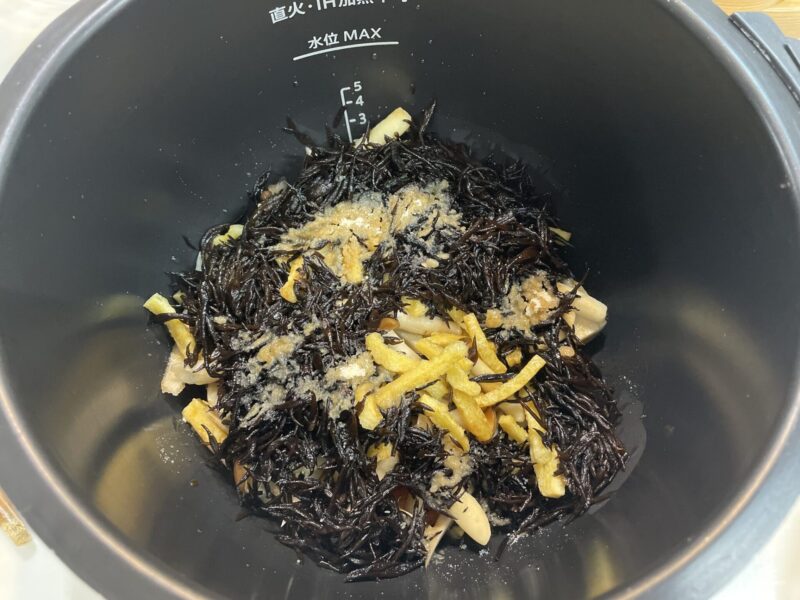 戻したひじきはザルにあげて軽く水洗いし、内鍋へ。