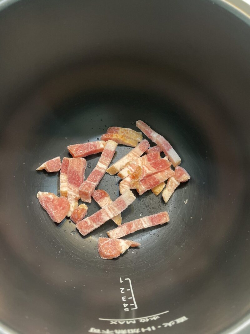 ホットクックの内鍋に、冷凍ベーコンをそのまま入れます。