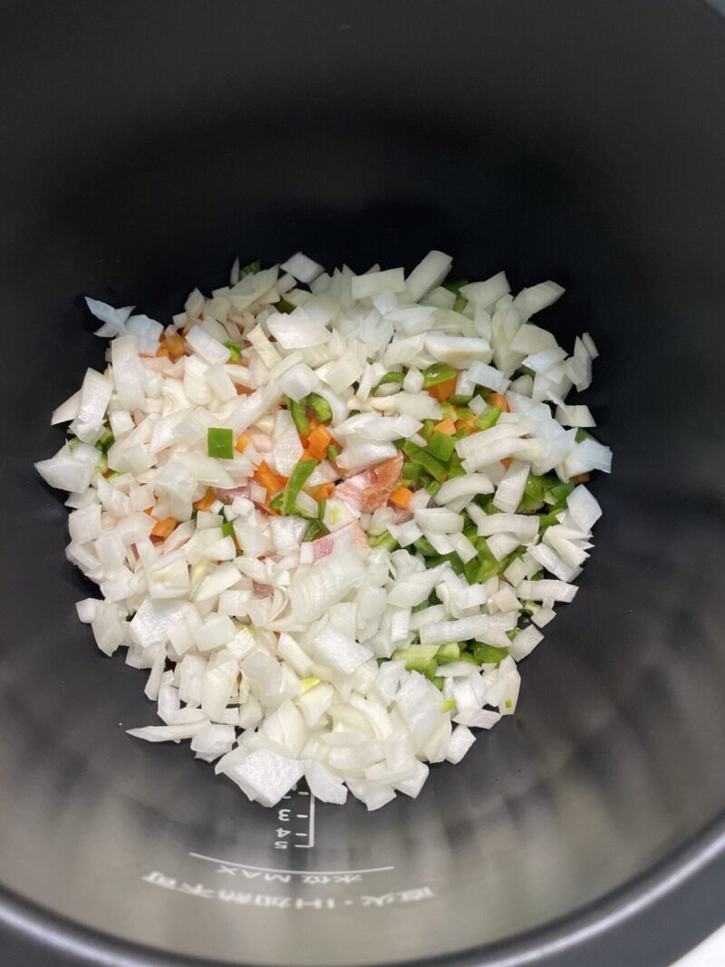 さらに、みじん切りにした玉ねぎ・ピーマン・にんじんを加えます。