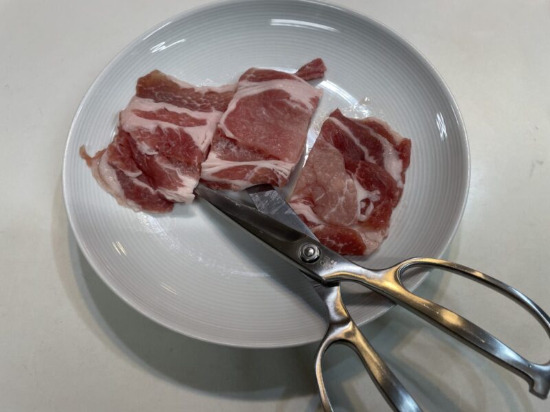 解凍した豚肉をキッチンバサミで一口大に切ります。