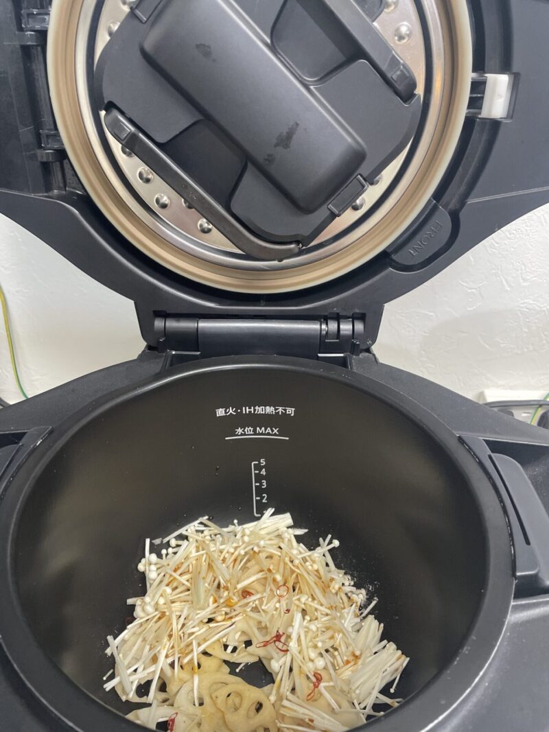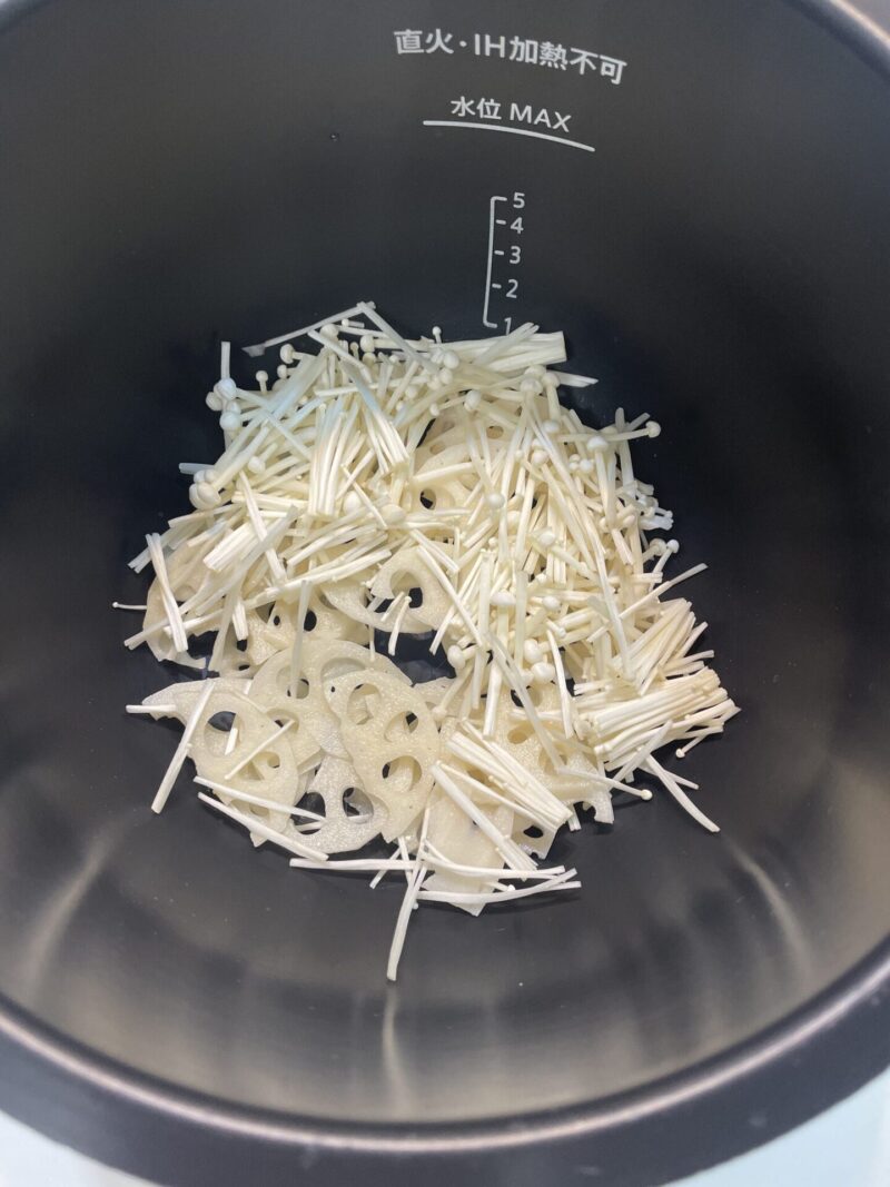 ③ ホットクックの内鍋に、レンコンとえのきを入れる