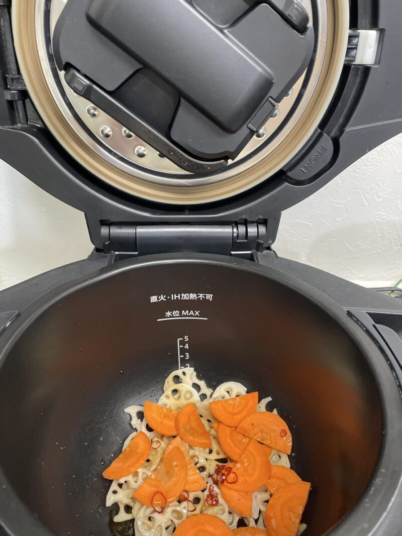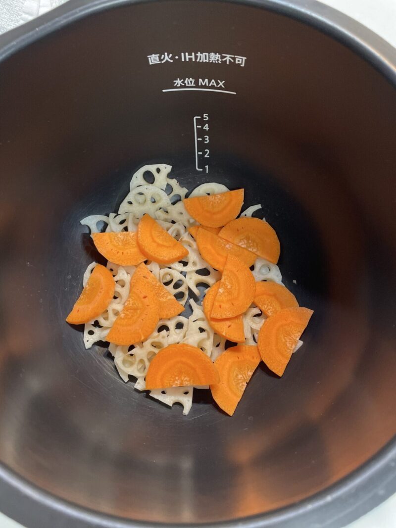 レンコンは薄切り、人参も薄切りにして、ホットクックの内鍋に入れます。