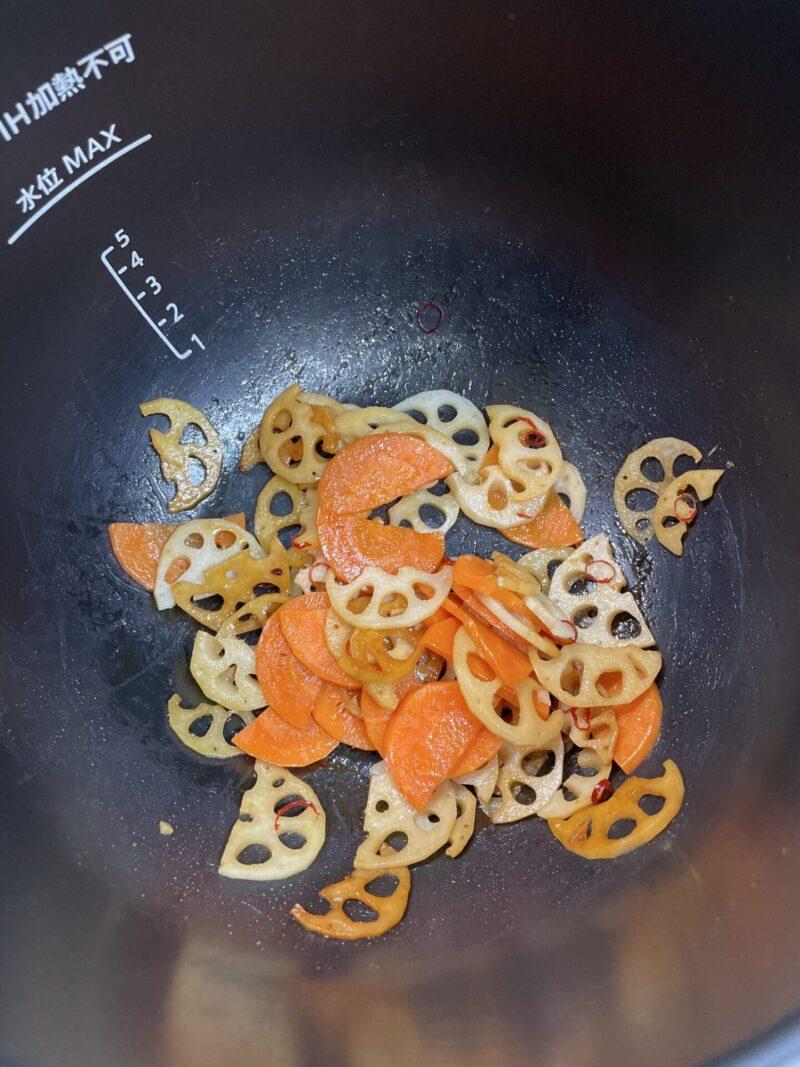 今回は炒め3分+予熱3分で、人参とレンコンの食感を残して仕上げます。