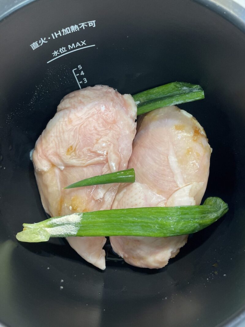 今回のレシピでは、冷凍した鶏むね肉を解凍せずそのままホットクックに入れて調理しています。