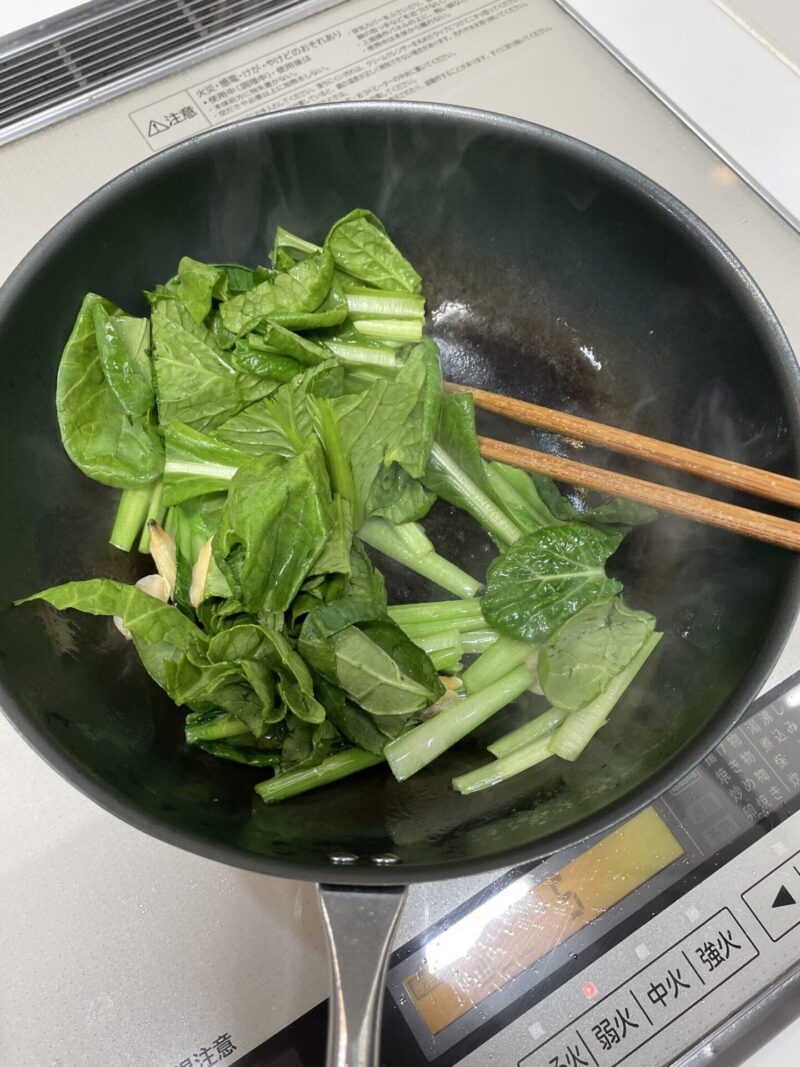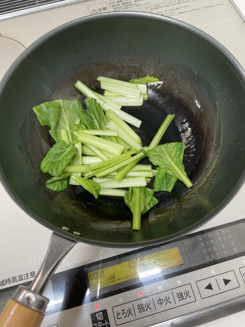 ② フライパンにごま油を入れて熱し、小松菜の茎の部分から炒めます。