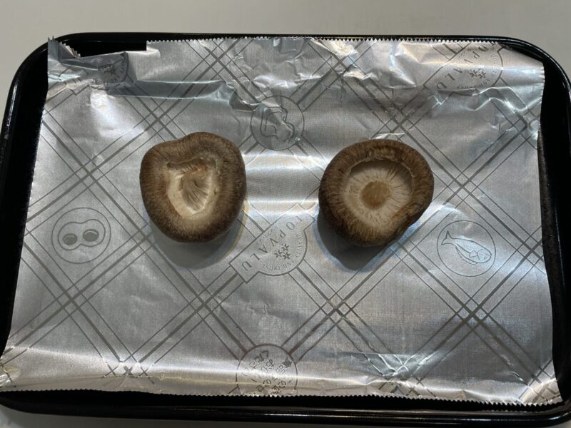 椎茸は軸をとり、かさを下にしてアルミホイルを敷いたトースターの天板に並べます。