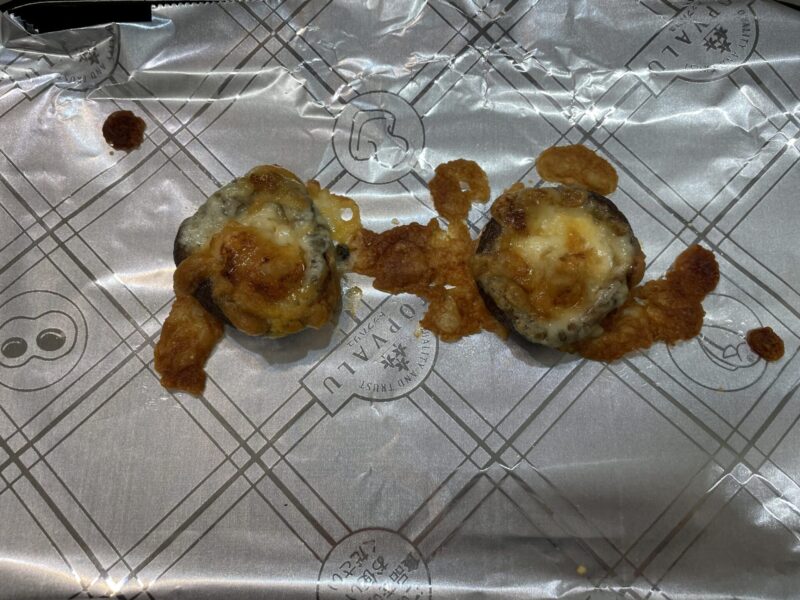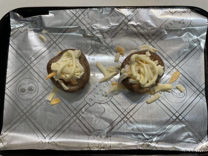 椎茸に火が通ったら、温度を上げて(200〜230℃目安)チーズに焦げ目がつくまで焼きます。