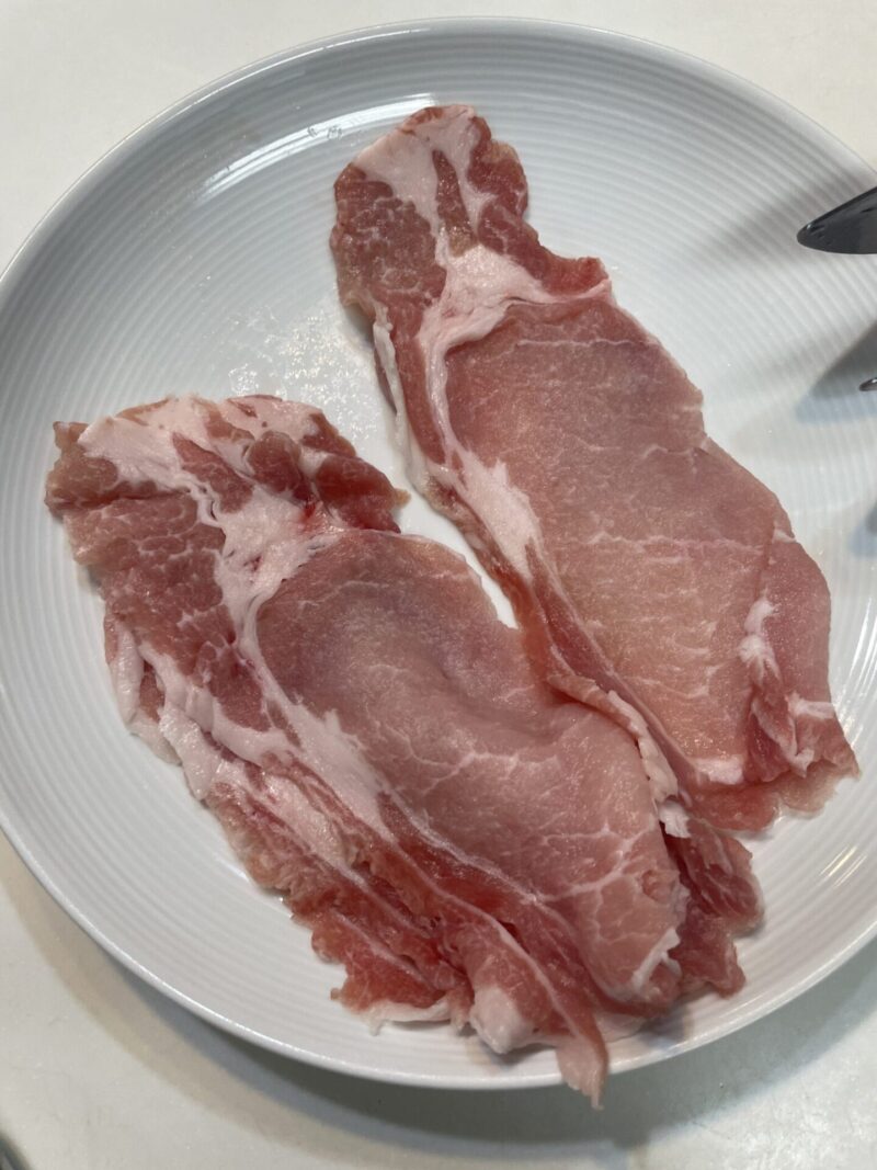 コストコで購入した豚ロース薄切り肉を、使う分だけ解凍します。