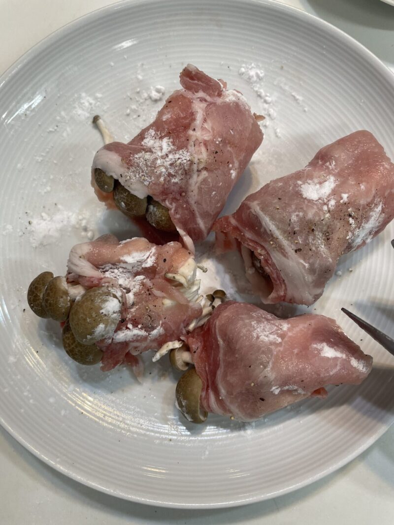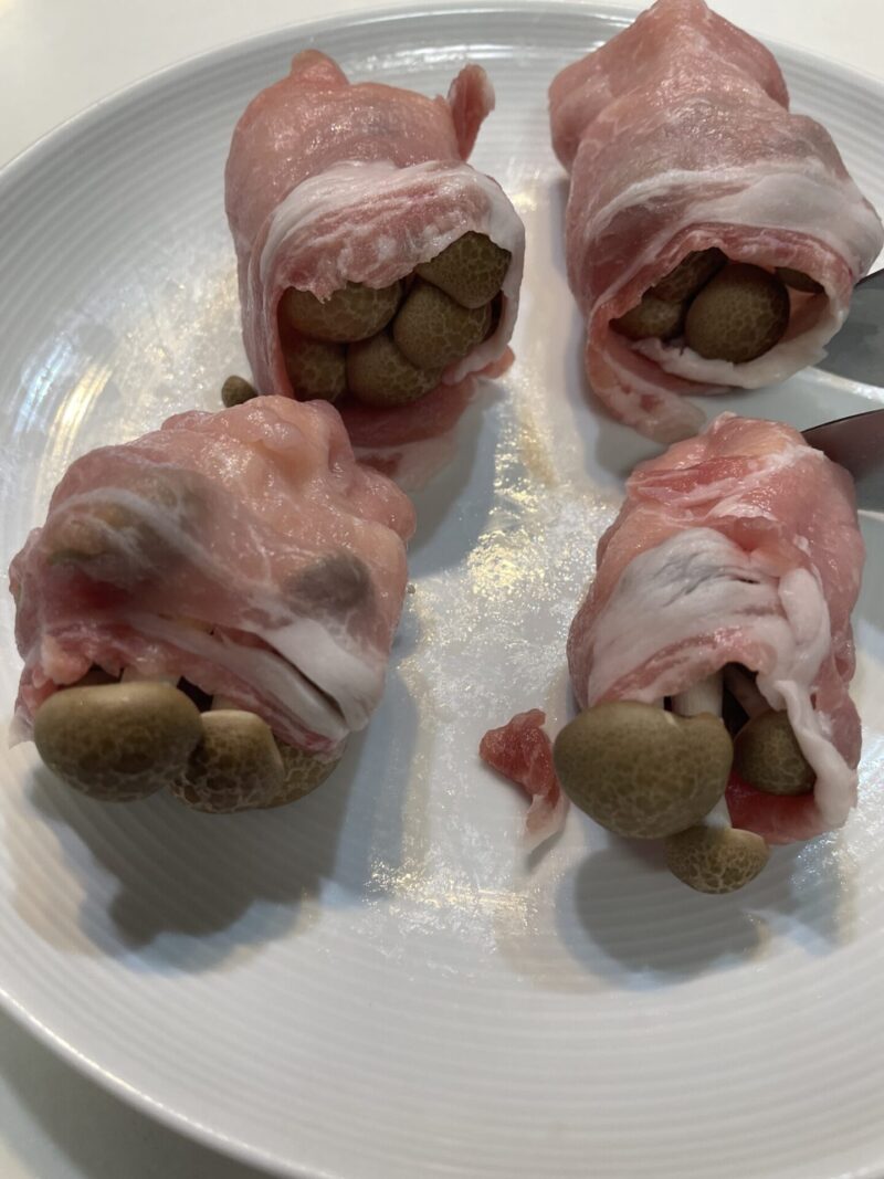 石づきを取ったしめじを、豚肉でくるくる巻いていきます。
