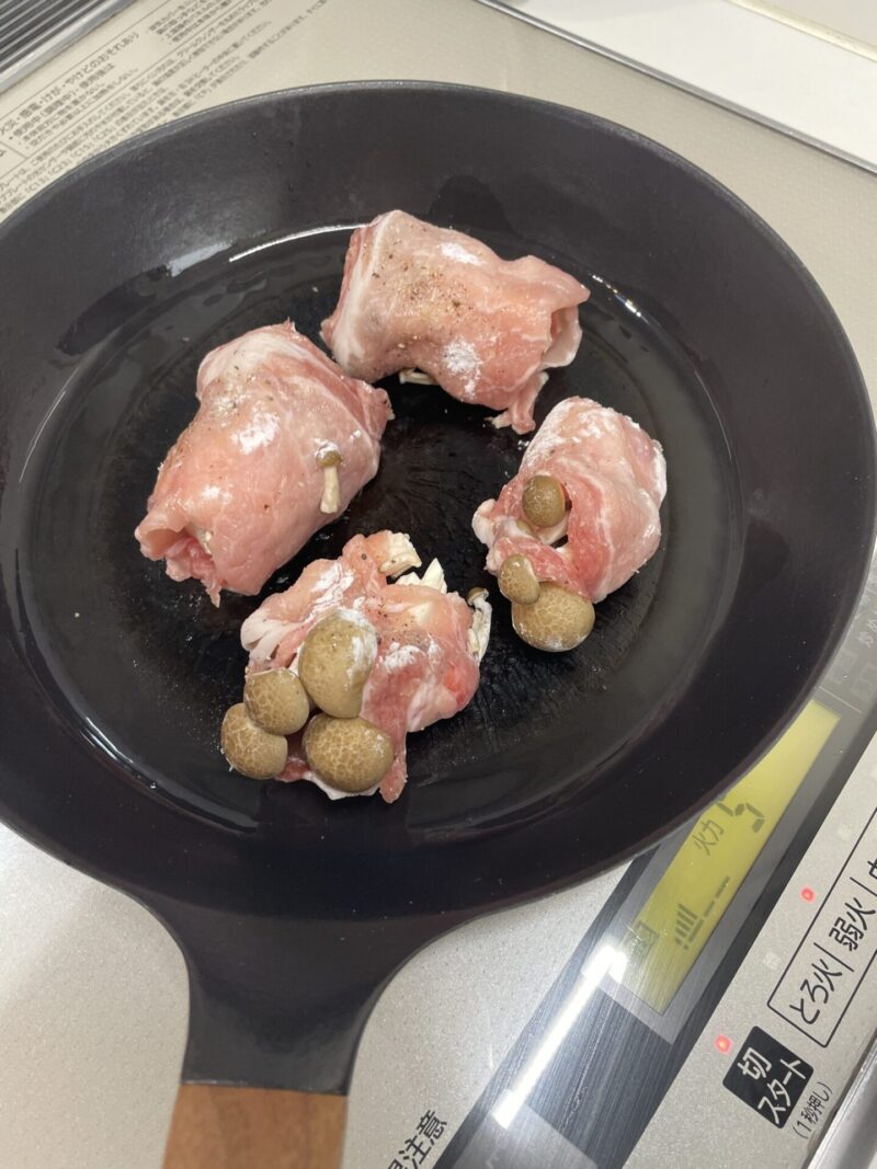 豚ロースの焼き色がプロ級に仕上がるのは、このフライパンのおかげ。シンプルな「しめじの豚巻き」も、驚くほどふっくらジューシーに焼き上がります。