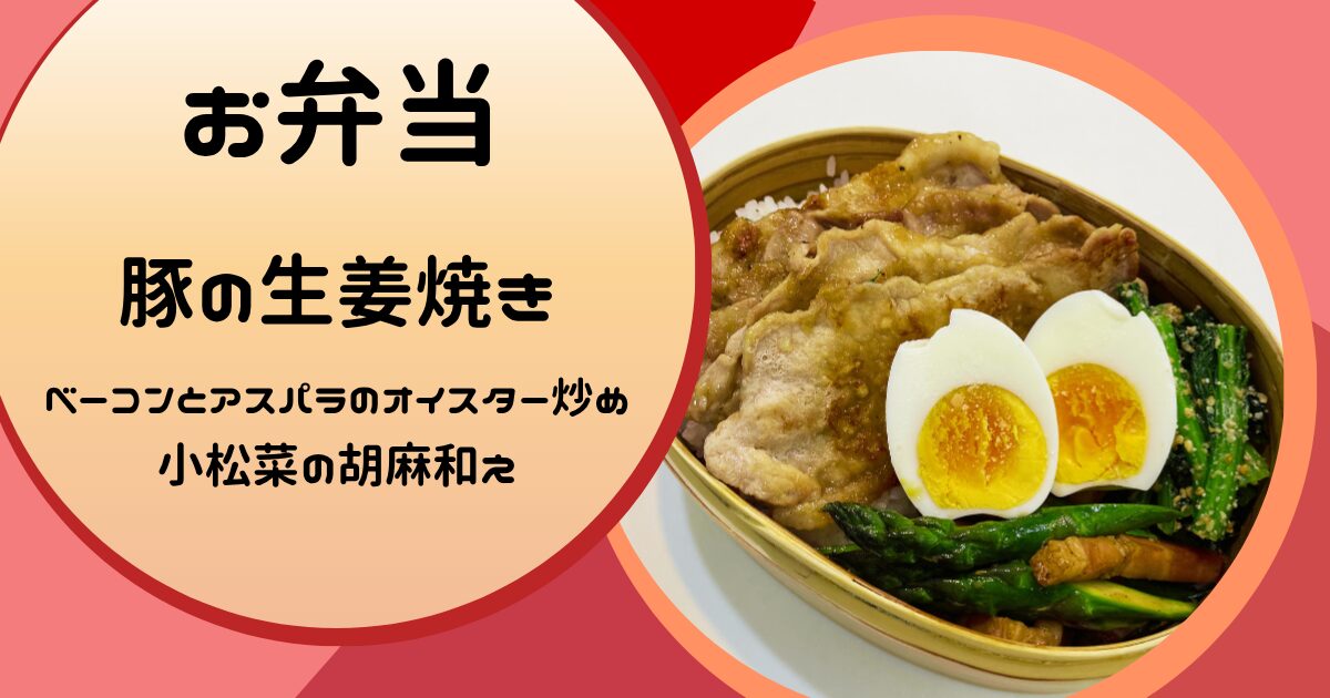 【お弁当】豚の生姜焼き弁当|ベーコンとアスパラのオイスター炒め・小松菜の胡麻和え