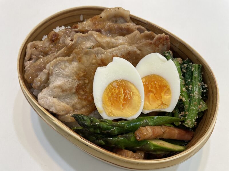 ・メインの生姜焼きは冷めても美味しくてお弁当向き ・庭のアスパラを使ったオイスター炒めで旬の彩りをプラス ・小松菜の胡麻和えでやさしい味のバランスを