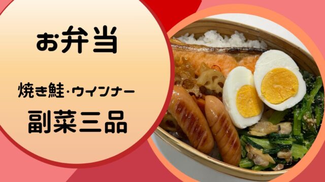【お弁当】鮭弁当+副菜3品(レンコンと人参のきんぴら・小松菜の胡麻和え・あさりと小松菜の炒め物)