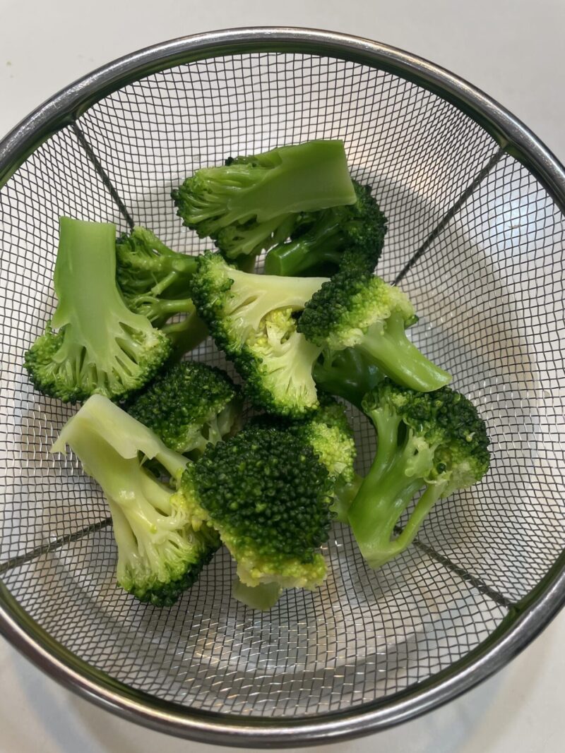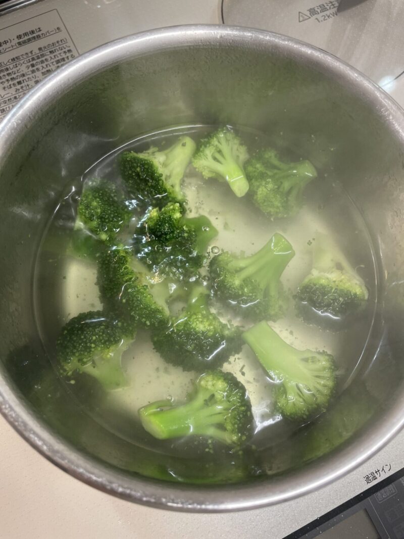 ① 冷凍ブロッコリーを塩を入れたお湯で、約1分軽く茹でる